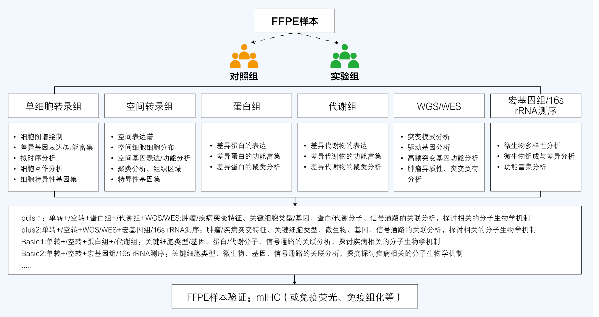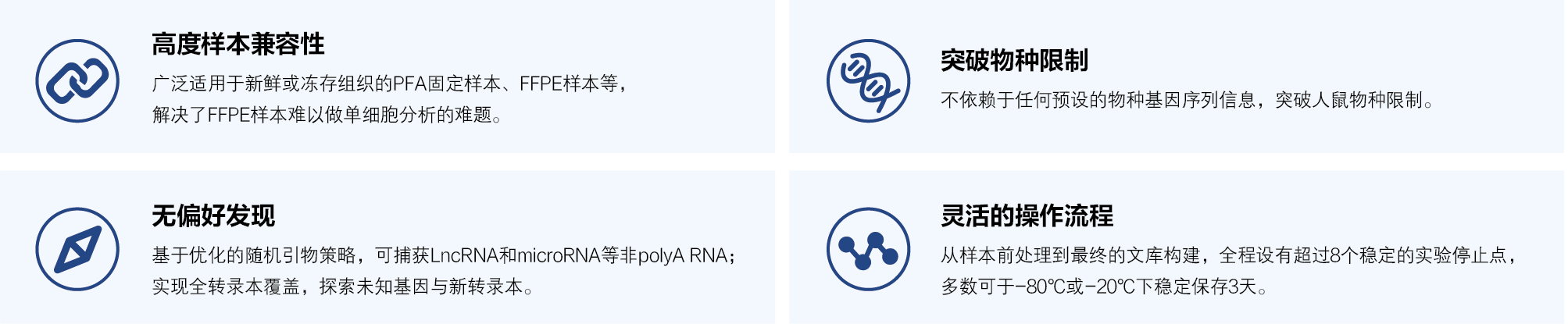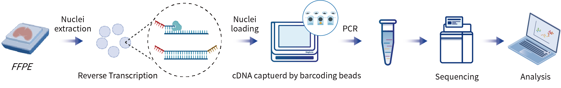 福尔马林固定石蜡包埋(FFPE)是全球临床病理学中用于组织样本长期保存和归档的金标准。新格元开发的FFPE单细胞核转录组测序产品,采用随机引物的无偏好性技术,对所有细胞核进行高效、均一的逆转录和接头连接,最大程度地将FFPE样本中降解的RNA信息转化为稳定的cDNA分子。随后,基于新格元成熟的微流控系统,高效地为来自单个细胞核的cDNA分子添加细胞来源的身份信息(Barcode);对FFPE样本、PFA固定样本(新鲜或冻存组织)进行灵活的单细胞分析。