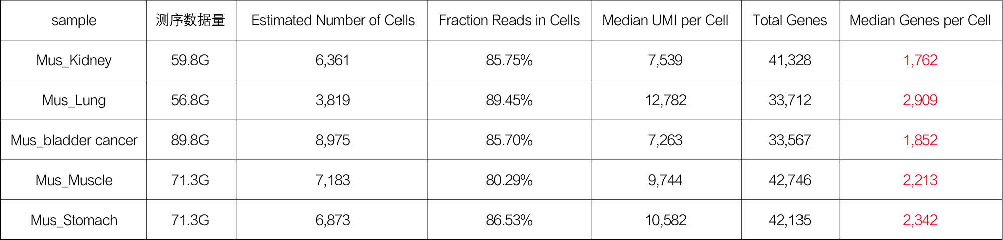 使用小鼠的肾脏、肺、膀胱癌等的FFPE组织样本进行单细胞核转录组测试,经提核获得了形态完整、背景干净的高质量细胞核;随后进行后续实验、测序、分析流程,结果显示基因检出数高,Fraction reads高,背景低。
